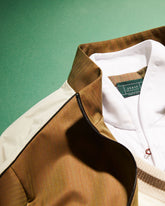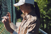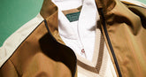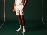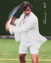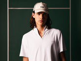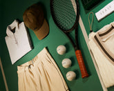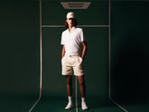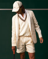 A nod to traditional British grass courts, this look is defined by a strict white palette. It features a polo shirt with the iconic Ellen collar and Solaro details, a cable-knit reversible vest, hemp shorts with a built-in belt, and a casual blazer — capturing the essence of the collection for members of the most prestigious clubs.