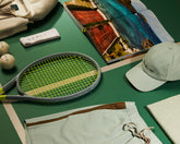 Inspired by red clay courts, this look is designed for those who split their vacation between a tennis match and a swim in crystal-clear waters. The turquoise seersucker evokes the sea and its hues, while the polo, made from a refined linen-cotton jersey with nylon inserts, ensures freshness and comfort in leisure settings.